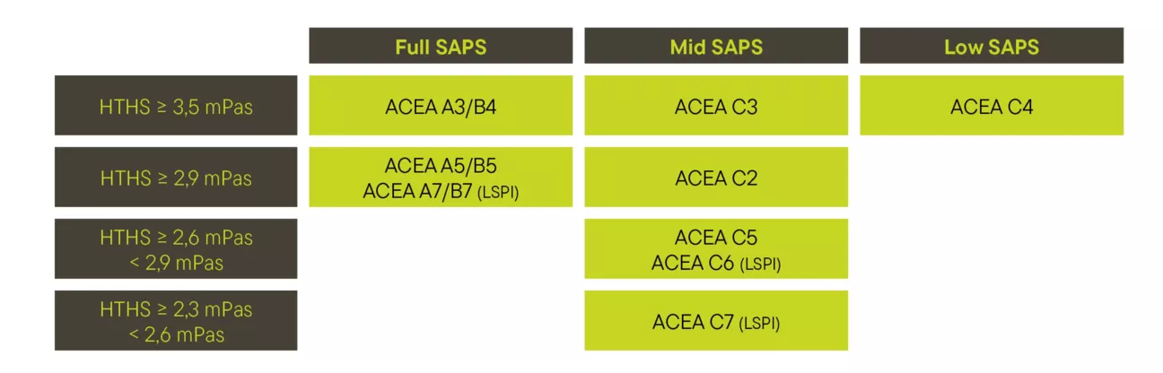 Gli oli motore conformi alle specifiche ACEA A7/B7, ACEA C6 o ACEA C7 sono dotati di un pacchetto di additivi che consente di ridurre il fenomeno LSPI.